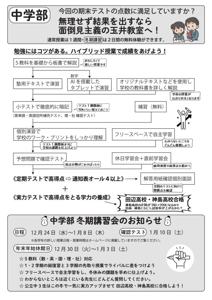2025/12/17 玉井教室 ニュース&トピックス 玉井教室 重要なお知らせ 【玉井教室】冬期講習会のお知らせ 冬期講習会のお知らせ 対象:小学生・中学生 日程:12月24日(水)〜1月8日(木)確認テスト 1月10日(土) ※各学年の詳しい授業日程・授業時間はこちらをご覧ください。 年末年始休館日:12月30日(火)〜1月3日(土)