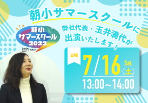 この度、弊社代表・玉井満代が 朝日学生新聞社さま主催の「朝小サマースクール2022」に出演いたします! お子様にも保護者様にもご参加いただける特別授業となっておりますので ぜひ親子でご参加くださいませ。 & […]