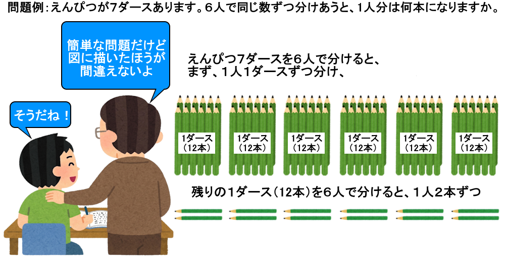 つぎの問題は4年生の初めのころに取り組むごく簡単な練習用の課題です。問題を読んでなんなく答えるお子さんも多いことでしょう。ですが、図と結び付けて答えを引き出すよう学習塾では指導しています。そのほうが具体的イメージを描けるのでミスが生じないし、図を用いて考える手法に慣れておくと、後々取り組み課題が難しくなった段階で効力を発揮するからです。