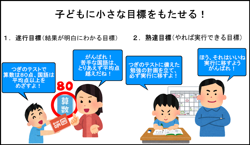 目の前に目標があると、子どもにとって大きな励みになります。その目標を親子で共有すれば、親も声かけのチャンスが増えるでしょう。一口に目標といっても、様々なタイプがあります。そのなかで代表的なものは、「遂行目標」と「熟達目標」です。前者は「テストで何番を取るか、何点を取るか」など、結果が明確に判断できる目標です。いっぽうの後者は、「算数の苦手単元をやり直す」とか「毎日1時間は勉強する」など、努力すれば誰でも実行可能な目標です。