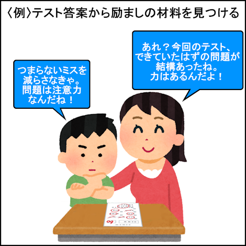 たとえば、とりあえずは成績面を度外視し、子どものメンタルの立て直しを図るのです。子どもの勉強のプロセスや、テストの答案から進歩している点や優れた点がきっと見つかります。それを指摘してほめてやるのです。具体例をあげてみましょう。