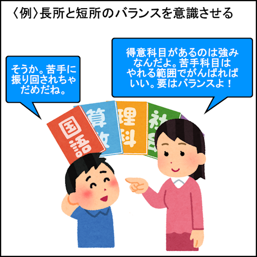 誰にだって不得手はあります。要はそれが極端な弱点にならないようにすればよいのです。子どもにそのことを伝え、自分の長所を大いに伸ばし、生かすことを勧めてやりましょう。