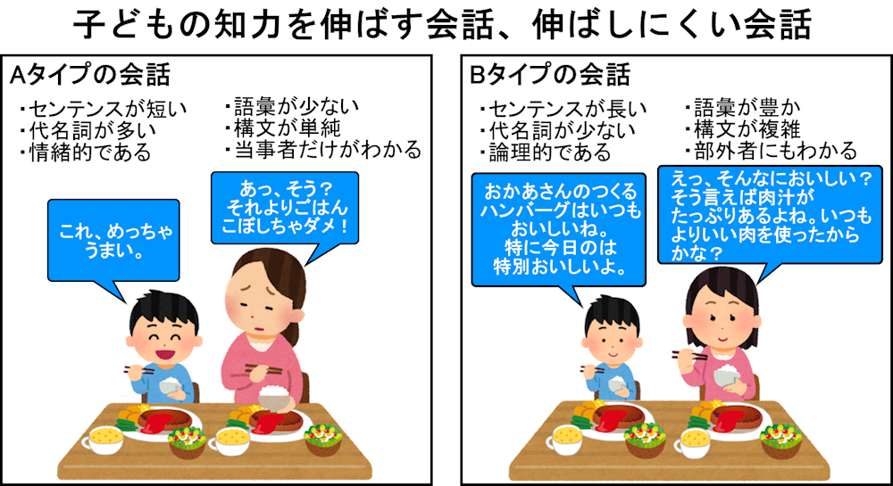 どちらの会話タイプが好ましいでしょうか。言うまでもなくBです。ただし、なかには「Aのほうが親しみを感じる」とおっしゃるかたもあるでしょう。それはそれで一理あります。つまるところ、良いか悪いかの価値基準ではなく、「どちらが子どもの知的成長に寄与するか」という問題なのだととらえるべきでしょう。では、なぜBタイプの会話が子どもの知的成長にとってプラスに作用するのでしょうか。