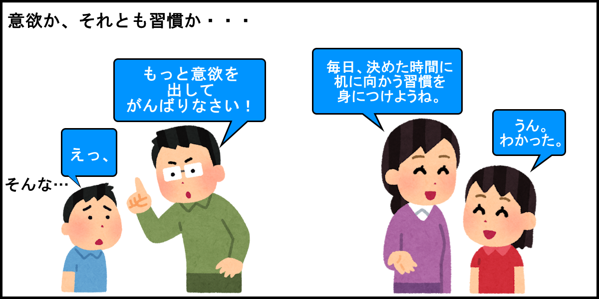 学習意欲と学習習慣。子どもが学力を伸ばしていくための道筋として、まずもって優先すべきはどちらでしょうか。むろん、どちらも甲乙つけがたい重要なものですが、有名な教育社会学者の著書に、「習慣づけを優先すべし」とありました。どういう考えが背景にあるのでしょうか。学習意欲は、勉強の面白さを知ってこそ湧いてくるもので、「もっと意欲をもちなさい」と親に言われて湧いてくるものではありません。まずは親子で話し合い、毎日決まった時間に机に向かって勉強する習慣をつけることが先決です。勉強が習慣になると、徐々に勉強の面白みもわかってきます。それにつれて意欲が増していきます。だから、「まずは習慣づけから」ということなんですね。