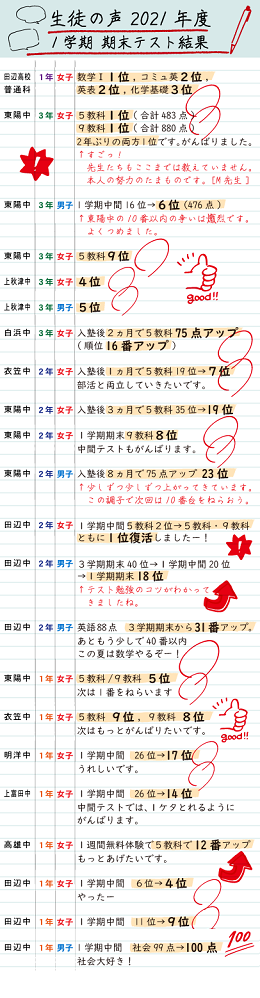 学力向上の秘訣は、学ぶことは楽しいと実感できること、そして、さらに学習習慣を身につけることです。そのためには授業に集中し、宿題や復習がしっかりできるようになるだけでなく、志を持ち、自分1人でも集中し継続的に勉強できるという学習姿勢の確立が必要です。玉井教室では正しい学習姿勢を身につけてもらえるよう、講師全員が全力でサポートしています。できる生徒が通うのが玉井教室?いえ玉井生だからできるようになるんです!!!